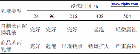 由表6可以看出, 采用自制的苯丙乳液制备的水性防锈涂料与采用普通商品苯丙乳液制得的涂料相比具有优异的防锈性能,在浸泡96 h 后,后者开始起泡,而前者依然完好,216 h后者开始出现锈点,而前者在浸泡408 h后才出现起泡现象,浸泡504 h后,后者已经严重腐蚀,而前者只有轻微腐蚀。说明采用本方法合成的苯丙乳液大大提高了涂料的防锈性能,主要是因为反应型乳化剂的应用、乳液交联以及磷酸酯功能性单体的加入,使得形成的涂膜致密,增加了涂层的附着力,减少了水分的渗透,耐水性明显增加,从而提高涂膜的防锈性。