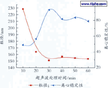 图2 超声波处理时间对粒径及离心稳定性的影响