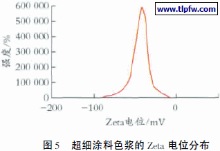 超细涂料色浆的粒径分布如图4 所示。图5 是超细涂料色浆的Zeta 电位分布。