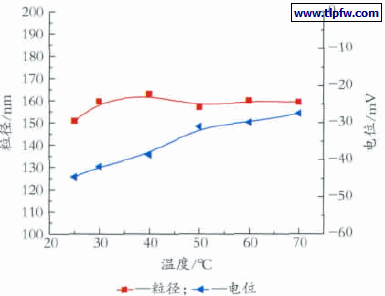 将超细涂料色浆在不同温度下放置6 h,冷却后,测试其粒径和电位,考察其对温度的稳定性,结果见图6。