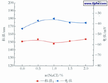 分别将不同质量分数的NaCl 加入超细涂料色浆中,测定其粒径和Zeta 电位,考察其对电解质的稳定性,结果见图8。