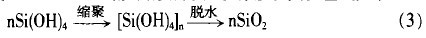 以上产物又能自聚成多聚硅酸,多聚硅酸进一步脱水缩合成一Si—O—Si一,从而形成了无机涂膜。其反应式如下: