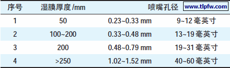 在涂料厂提供的施工技术说明中,均标明了该涂料在规定膜厚下,推荐的喷嘴孔径。表3 为阿克苏诺贝尔(苏州)工业涂料有限公司依据湿膜厚度推荐的喷嘴孔径表,仅供参考。