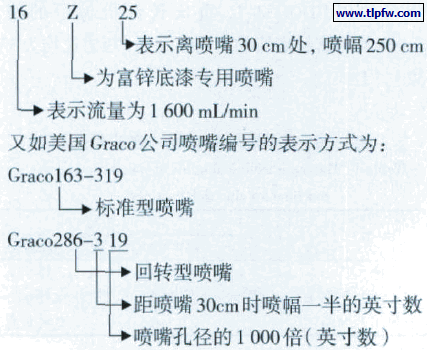 德国WAGNER 公司则有另外的表示方式,如编号为0090521,0090 为标准型喷嘴,喷漆压力为10.0 MPa,喷距为30 cm;5 表示喷射角度为50°;21 表示孔径为0.021 英寸。