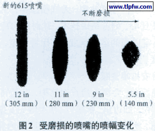 需强调的是:经过一段时间的使用,喷嘴不同程度受到磨损,喷孔变得大而圆,流量增大,喷幅变小(图2),严重影响涂层外观及膜厚质量。通常在扇形幅度小于250 mm时,需及时更换喷嘴。