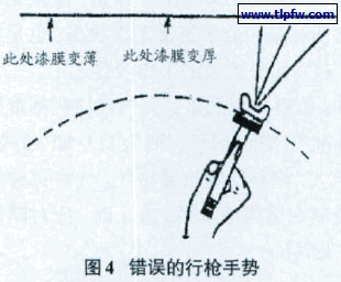 喷涂时,如果离喷涂表面太近,会引起涂料堆积,涂膜厚度过大及流挂的产生;如果太远,又会引起干喷,涂料不能有效地呈湿态附着,见图5。