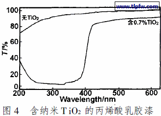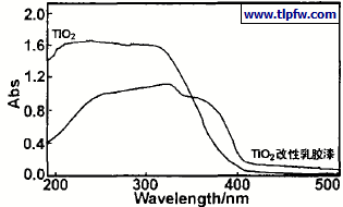 太阳光中的紫外线是造成乳胶漆老化的一个重要因素。紫外线波长介于200 ~ 400nm 之间, 分为UVA、U VB、UVC 3 个区段, U VC( 200~ 275nm) 可被同温层的臭氧吸收, 到不了地面。而UVB ( 280 ~320nm) 、UVA( 320~ 400nm) 能作用于各种材料、物质表面及内部, 造成材料老化。紫外线的波长越短, 能量越强, 对乳胶漆的耐久性危害也就越大。虽然内墙乳胶漆的老化现象较之外墙乳胶漆要轻缓许多, 但在室内有较强烈光线影响及照明作用时, 对内墙乳胶漆的老化作用仍不能忽视。经纳米TiO2 改性的乳胶漆则可以散射紫外线, 但不反射可见光。未经改性的乳胶漆和经纳米T iO2 改性的乳胶漆对紫外光的屏蔽效果如图4 所示。