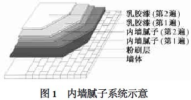 本内墙腻子系统(见图1) 工艺原理在于腻子层材料的选取和比例选择,通过胶结料、骨料、填料和助剂的选择和配比来达到腻子防裂、环保的目的。