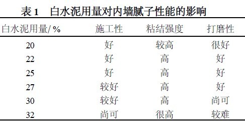 21212 白水泥用量对腻子性能的影响(见表1)