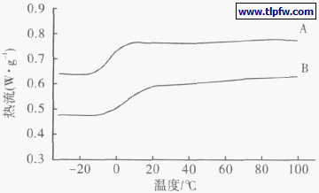 由图2 可见, A 曲线上只出现了一个玻璃化温度Tg 转变区间, Tg 为- 11 ℃, 说明得到的丙烯酸酯共聚物是无规共聚物, 不存在相应的均聚物。B 曲线也只出现了一个Tg 转变区间, Tg 点为5 ℃,