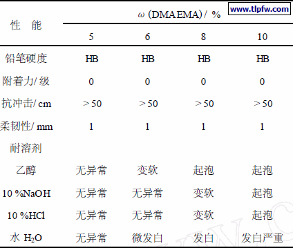 改变DMAEMA 的质量分数, 得到不同的丙烯酸树脂分散体, 将它们按113 所示方法制备涂膜,固化膜性能列于表1 。