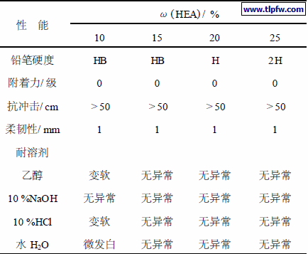 由表2 可见,随着HEA 用量增加涂膜的硬度提高,最高可达到2H ,附着力、抗冲击、柔韧性等性能一致,HEA 质量分数为10 %时,涂膜的耐水性和耐化学品性稍差,是因为OH —含量低,与固化剂交联密度不够;当HEA 质量分数大于15 %以后,耐化学品和耐水性提高不大,且OH —含量过高,固化剂用量多,成本高,因此,HEA 用量为15 %较合适。