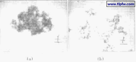 图1 为未改性的超细二氧化硅(a) 和改性的超细二氧化硅(b) 的TEM 照片。可见未改性的超细二氧化硅在乙醇溶剂中聚集成团,而经改性的超细二氧化硅在乙醇溶剂中的分散性明显改善,改性后的超细二氧化硅虽然仍有小团聚体存在,但大多是以边角粘结在一起形成附聚物,而附聚物分子之间的吸引力要弱得多。