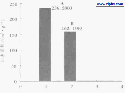 图4 是未经改性处理的超细二氧化硅粉体和改性后超细二氧化硅粉体的比表面积。可以看出经改性处理的超细二氧化硅粉体的比表面积有所减小。比表面积的定义为单位质量的粒子的表面积。二氧化硅是一种具有一定微孔结构的物质,吸附法测定的比表面积包括粒子外表面和内微孔的表面积之和,改性过程由于表面改性剂在外表面和孔内部的吸附,使得改性后比表面积减少。