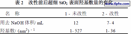 表2 是超细SiO2 表面改性前后羟基数量的变化。从表中看出,改性后的超细SiO2 消耗NaOH 的体积要小于未改性超细SiO2 消耗的NaOH 的体积,表面羟基数量从1.527/ nm2 减少到1.36/ nm2 ,说明改性剂与超细SiO2 表面的羟基发生键合,失去水分子,使其表面羟基数减少。