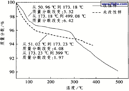 图5 是改性前后超细SiO2 粉体的热损失质量分析,两样品在测试前均在110 ℃下烘干22 h 。未改性和改性的超细SiO2 在温度从50 ℃升高到500 ℃时,质量均有减少,但是2 个样品的热损失质量曲线并不相同。未改性的超细SiO2 粉体,当温度从51.02 ℃升高到173.23 ℃,损失质量为4.08 % ,是由于样品中仍含有的少量水分所致。温度从173123 ℃升高到399.4 ℃,损失质量为1.97 % ,是由于在制备过程中加入的少量表面活性剂引起的损失质量, 温度从51.02 ℃升高到399.4 ℃热损失质量逐渐减小。而改性超细SiO2 粉体温度从50.96 ℃升高到173.18℃,损失质量为3.32 % ,说明改性后二氧化硅的疏水性增强, 含水量下降。温度从173.18 ℃升高到499.08 ℃,损失质量为6.42 % ,并且在300 ℃附近有一个损失质量突变点,是超细SiO2 表面改性剂高温分解所致,改性剂KH570 的沸点是290 ℃。大于350 ℃,仍有损失质量,说明相当一部分改性剂与超细二氧化硅表面是化学作用。在400 ℃,改性后超细SiO2 的热损失质量比未改性高1.43 %。