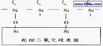 硅烷偶联剂与超细二氧化硅的作用机理为改性剂以单体或低聚物形式与超细二氧化硅表面羟基缩合,失去水分子,而接枝在超细二氧化硅表面。由于在改性过程中硅烷偶联剂是经充分水解后加入二氧化硅水悬浮液中,硅烷偶联剂在水解过程中易彼此缩合形成低聚物,并且在水悬浮液中低聚物与单体相比由于分子结构较大,羟基较多,有更多的机会参与二氧化硅表面的脱水缩合,因此可推断硅烷偶联剂与超细二氧化硅表面作用机理如下: