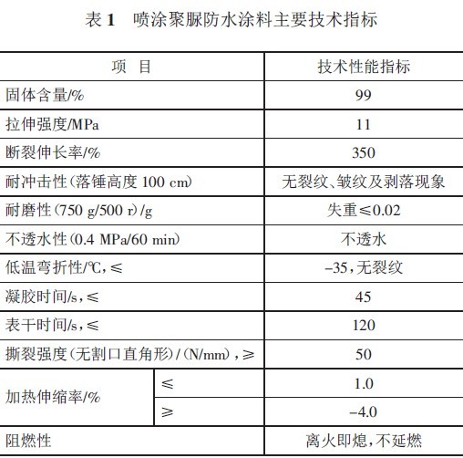 A、R 两组分通过专用高温高压喷涂设备喷涂雾化成膜,并在室温下养护7 d 后,按GB/T 23446—2009《喷涂聚脲防水涂料》标准要求(表1)测试其性能。要求喷涂压力15~17 MPa,温度(主加热器和管道加热器)62~70 ℃,膜厚2 mm。