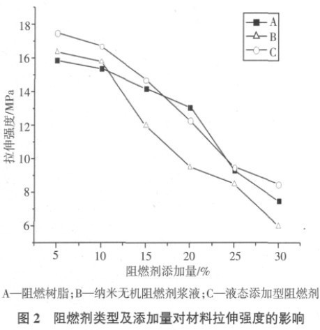 2.2.1 阻燃剂类型及添加量对拉伸强度的影响