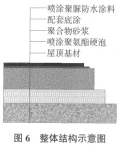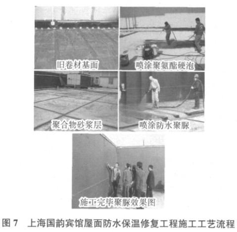 上海国韵宾馆屋面防水保温修复工程于2010 年底完工,其屋面整体构造见图6。施工工艺流程:在旧卷材基面上喷涂聚氨酯硬泡(保温)→刮聚合物砂浆(防火)→滚涂聚脲配套底漆→喷涂聚脲(防水)(图7)