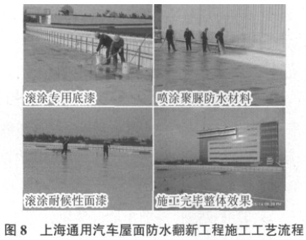 上海通用汽车屋面防水翻新工程于2011 年5 月新近完工,屋面面积3 万多m2,该工程采用秀珀专用底漆,解决了聚脲在旧卷材基面的粘结问题。施工工艺流程:卷材上涂刷专用底漆→喷涂防水聚脲→罩耐候面漆(图8)。
