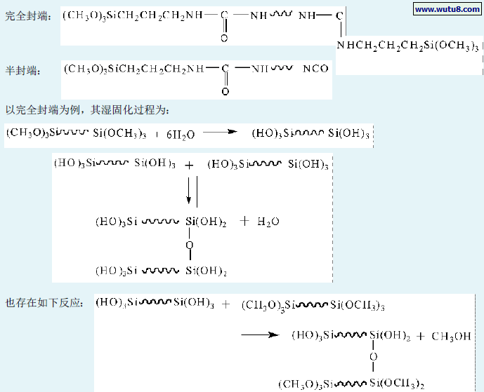 专利文献报道〔1〕:添加一定量的特种发泡抑止剂或匀泡剂,可消除单组分湿固化聚氨酯密封剂固化物中目视可见气泡,即使生成的气泡细微地均匀地分散于密封剂固化物中,也不形成可目视的气泡。端NCO基聚氨酯预聚体,添加特种发泡抑止剂或者粘接促进剂所组成的体系,可称之为“预聚体- 潜固化剂”型湿固化密封剂组成物,所采用的潜固化剂为带有醛亚胺或酮亚胺的化合物。但采用潜固化剂的单组分湿固化聚氨酯密封剂仍存在着贮存稳定性问题,因为这些潜固化剂能极缓慢地直接与聚氨酯预聚体上NCO 基团反应,使得体系的粘度随贮存时间的延长而增大。更为可取的方法是既不改变该类涂料吸湿固化的特性,又可从根本上避免固化过程中产生CO2 气体,这就是对端NCO 基聚氨酯预聚体进行化学改性。在聚氨酯分子链端接上其它活性基团,比如用有机硅烷封端或用环氧树脂改性等。硅烷偶联剂通式可以表示为:Y — R — SiX3。X 和Y 是两类反应特性不同的活性基团,可以在端NCO 基团的预聚体中引入含活性端基— OH、— NH2 的硅烷偶联剂,或在端OH的预聚体中加入含NCO 基团的硅烷偶联剂,从而合成端硅氧烷基封端的聚氨酯预聚体。端硅氧基团在催化剂存在的条件下,借助空气中的湿气,硅烷基团水解固化成硅醇,进而与另一个硅醇或硅烷基团反应交联成网状结构,产生粘结。这样可以避免NCO 基团直接与水反应而产生过多气泡,造成过多的粘结缺陷,影响粘结强度的弊端,解决了起泡和不耐水的问题,而且拉伸、粘结性能、耐老化性能也得到了提高。另外,硅氧烷与水的湿固化速度较慢,也有利于部分封端的聚氨酯预聚物CO2 气泡的排放。这类用硅烷化合物(如氨丙基甲氧基硅烷)封端的聚氨酯预聚体结构如下: