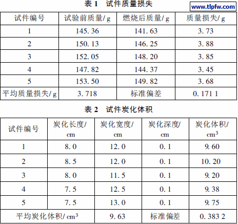 实验结果: 将燃烧过的试件取出冷却至室温, 准确称量, 精确到0. 1 g。一组试件(5 个) 燃烧前后的平均质量损失取其小数点后一位数即为防火涂料试件的质量损失。用锯子将燃烧过的试件沿着火焰延燃的最大长度、最大宽度线锯成4 块。量出纵向、横向切口涂膜下面基材炭化( 明显变黑) 的长度、宽度, 再量出最大的炭化深度, 取其平均炭化体积的整数值即为防火涂料的炭化体积。炭化体积按式( 1) 计算。