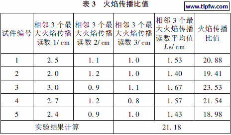 实验结果见表3。石棉标准板火焰传播比值La =0. 43 cm, 标准橡木板火焰传播比值为Lr= 5. 70 cm, 隧道炉的矫正常数为K =100/(Lr- L a)= 18. 98 cm- 1 , FSR= K( L s- L a) 。