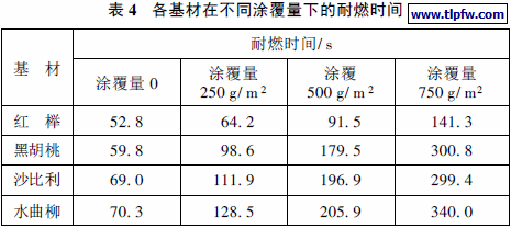 ( 4) 不同木质基材使用相同量的同种防火涂料处理,阻火效果不一, 其中以红榉的效果最差。要达到相同的耐燃效果, 木质基材所需涂覆的防火涂料量不同。