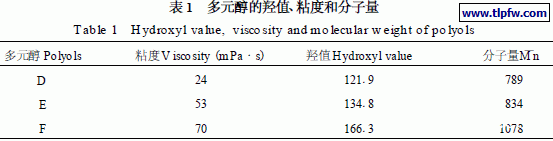 11212 多元醇组分的合成 将A、B 和C 分别用过量二甘醇, 在催化剂存在下高温反应, 待酸值小于5 后, 减压回收过量二醇, 所得产物依次称为多元醇D、E 和F。有关理化参数见表1。