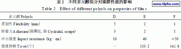 将多元醇D、E 和F, 分别在各自的最佳配比下与HMMM 混合, 按1.3 节制备漆膜, 再按1.4 和1.5 节进行有关性能测定, 所得结果列于表2 中。