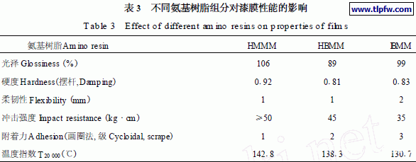 选用HMMM、HBMM 和IBMM 等3 种氨基树脂与多元醇F 交联, 讨论不同氨基树脂组分对漆膜性能的影响。有关漆膜制备及性能测试方法同211 节, 所得结果见表3。