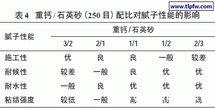 由表4 可见:重钙/ 石英砂配比较大时,调制后腻子的施工性好,刮涂容易,但腻子的耐候性差,粘结强度低;随着重钙/ 石英砂配比降低,腻子的耐候性及粘结强度均有所提高,但填充性及施工性变差。综合考虑腻子的各项性能,重钙/ 石英砂配比以1/1 为宜。