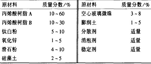 金红石型二氧化钛,工业级;氧化锌,工业级;轻钙,工业级;滑石粉,工业级;空心玻璃微珠,上海格润亚;消泡剂、试剂,德谦化工。