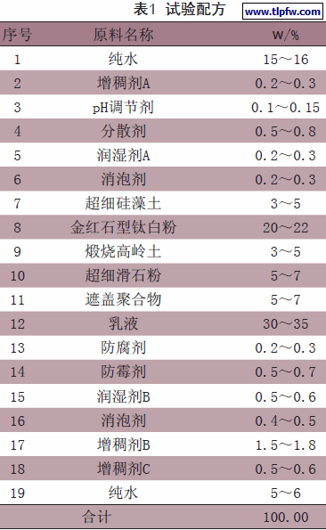 自交联纯丙络合银离子乳液:EP-18 (国外某厂家试验样品);钛白粉:Ti-R902+;煅烧高岭土:HS801A;1250目超细滑石粉;1 500目超细硅藻土;消泡剂和润湿分散剂:科宁化学、科莱恩以及杜邦;防腐防霉剂: P C T S化学;缔合型增稠剂:陶氏化学;遮盖型聚合物:陶氏化学;NaOH:化学分析级;纯水。