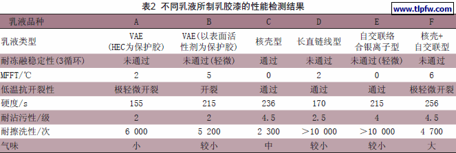 本试验分别选取国外知名化学公司研发的6种乳液,分别是: V A E(H E C胶体保护)、V A E(表面活性剂保护)、核壳类型、长直链线型高分子聚合型、自交联络合银离子型、核壳+自交联双功能型,试验配方分别标号为A、B、C、D、E、F代表制备成P V C为50%的内墙乳胶漆,配方中不加任何成膜助剂和抗冻剂。试验结果如表2。