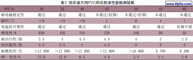 本试验选择自交联络合银离子的功能性乳液,不加任何成膜助剂和助溶剂,改变涂料的P V C,考察涂料P V C对内墙涂料成膜性和涂膜机械性能的影响。并选择最合适的P V C范围。同乳液不同P V C的乳胶漆性能检测结果如表3。