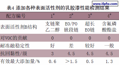 冻融稳定性对普通水性乳胶漆是很容易解决的问题,普通的方法就是多加点E G或P G降低水的冰点。但对超低V O C涂料来说,E G和P G不能添加使用,在这种情况下要通过选用不含V O C且能有效降低水的冰点提高乳液稳定性的表面活性剂B来提高产品冻融稳定性。试验以45%配方为基础添加各种表面活性剂B,测试结果如表4。
