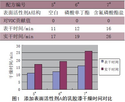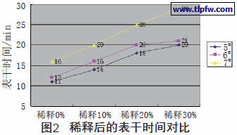 从表5和图1中可以看出,添加含氟磷酸酯盐的表面活性剂对原超低V O C体系(5#样品)的表干实干都有较为明显的帮助。同时分别将上述3个样品按习惯进行30%稀释后再次比较表干时间,结果如图2。