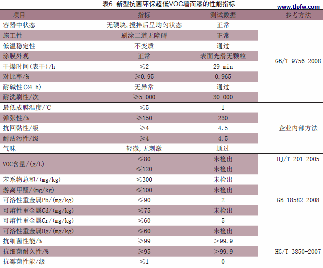 根据上述优化试验所制得的新型抗菌环保超低VOC墙面漆的性能指标具体如表6。