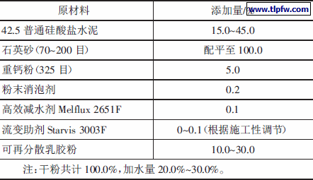 采用42.5 等级的“海螺”牌普通硅酸盐水泥。聚合物乳胶粉选用巴斯夫的高柔性丙烯酸胶粉Acronal誖P 5033,同时采用柔性醋酸乙烯-乙烯共聚乳胶粉(VAE 乳胶粉)作对比,这两种聚合物具有相同的玻璃化温度(-15 ℃),最低成膜温度均小于0 ℃。配方用到的助剂包括:高效分散减水剂,利于水泥等无机材料均匀分散,容易搅拌;消泡剂,消除搅拌过程中带来的气泡,避免有害孔洞形成;流变助剂,保证涂料的均匀度和可涂刷性,避免泌水离析。