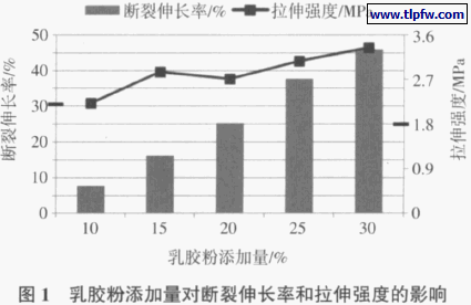 在固定水泥用量(30%)的前提下,对Acronal誖P5033 乳胶粉不同添加量时(10%~30%)制得的JS 防水涂膜按GB/T 23445—2009 检测其性能。图1 是Acronal誖P 5033 乳胶粉添加量对JS 涂膜断裂伸长率和拉伸强度的影响。从图1 可看出,随着乳胶粉添加量的增加,涂膜的断裂伸长率呈线性增长。乳胶粉添加量为25%时,涂膜的断裂伸长率达到37%(采用VAE 乳胶粉,添加量为30%时制得的JS 涂膜只有15%的断裂伸长率),完全满足GB/T 23445—2009 标准对Ⅲ型产品的断裂伸长率要求(30%);此时涂膜的拉伸强度在2.2 MPa 以上,也完全标准对Ⅲ型产品的拉伸强度要求(1.8 MPa)[2]。因此,25%的Acronal誖P5033 乳胶粉添加量是满足标准对Ⅲ型产品要求的合适添加量,并有一定的富余空间。对涂膜进行耐水测试,结果表明,浸水后涂膜的断裂伸长率会稍有下降而拉伸强度略有升高,主要是浸水后水泥继续水化造成的。