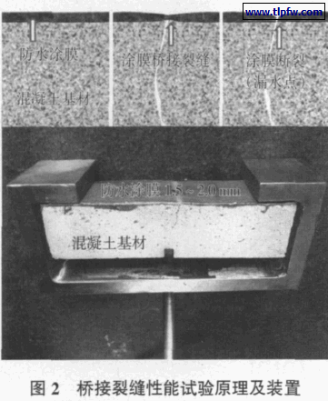 混凝土收缩等因素造成的裂缝不可避免,在有保护层时允许其裂缝宽度放宽至0.4 mm,属于无害裂缝,而是否可以抵御混凝土后期开裂≤0.4 mm 的裂缝是评价防水材料持久性的关键所在,也就是我们说的桥接裂缝能力,其测试原理可详见图2 上半部描述。这一性能测试在目前的国标中并未体现,而它是国外防水材料常用的检测项目之一。本研究参考欧标ETAG 022《室内潮湿墙地面防水技术要求》Part 1进行静态桥接裂缝测试[3],试验装置见图2 下半部。试验基材为加入钢丝或纤维的砂浆块,养护后在其一面分2 次涂覆JS 防水涂料,干膜总厚度约为1.5~2.0mm;养护至龄期后,通过推进下方螺栓直到试块有可见开裂纹,再以0.02 mm/min 速度使裂纹打开变成0.4 mm 的裂缝,保持裂缝宽度24 h 后观察防水涂层是否断裂或有破损孔洞。