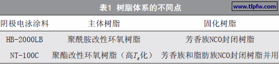 为了提高电泳涂料的泳透力,对树脂体系进行了改进,与现用电泳涂料HB-2000LB的不同点见表1。另外,还通过采用低中和度和F-2的疏水化技术来提高泳透力。