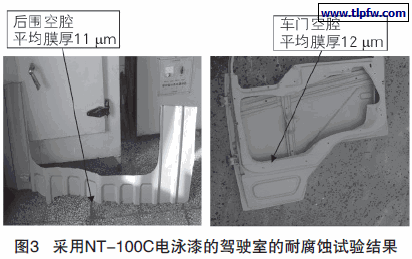 c.降低了生产成本。使用NT-100C高泳透力电泳漆使外表面膜厚大幅下降,降低了汽车用材料成本。经实际用量统计,每台节约电泳漆1.83 kg,节省电泳漆材料近30%,单台驾驶室节约成本59.24元;节约能耗8元。2008年2月􀀀2009年3月,青汽厂共生产68 162台驾驶室,共节约成本400多万元。