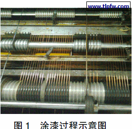 选择型号为0.38 mm 铜线,底漆为聚酯酰亚胺绝缘漆,涂线7 道,漆厚度为0.03~0.04 mm,面漆为自粘漆,涂线3道,漆厚度为0.01~0.02 mm。进口炉温320 ℃,中间炉温420 ℃,出口炉温430 ℃,热风温度360 ℃,线速57 m/min。图1 所示为涂漆过程示意图。