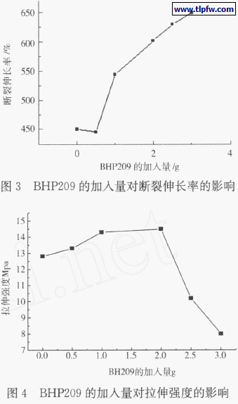 图3 和图4 为加入不同量的BHP209 后对聚氨酯防水涂料性能的影响