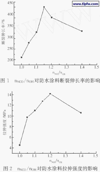 通过调节体系的nNCO / nOH ,可以改变交联密度。研究了不同的nNCO / nOH 对聚氨酯防水涂料的影响,结果见图1 和图2 。