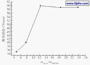 图5  MOCA/ BHP209 的投料比对撕裂强度的影响