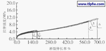 在图8 中,线1 、2 、3 为加入未研磨填料后材料的测试曲线,线4 、5 、6 为加入研磨后填料的材料测试曲线,从测试曲线可见,填料加入工艺对涂层性能有较大的影响。当加入未研磨固体填料时,材料的机械性能降低,这是因为粒径太大,破坏了材料的连续性;而当加入经过研磨,细度为20μm 的填料时,涂层的机械性能增加,这是因为研磨后的填料的活性表面增加,并与周围某些的分子形成次价交联结构,彼此之间的作用力增大,当受到应力作用时可通过交联点将应力分散,减少应力集中,延缓断裂的发生,从而提高机械性能。